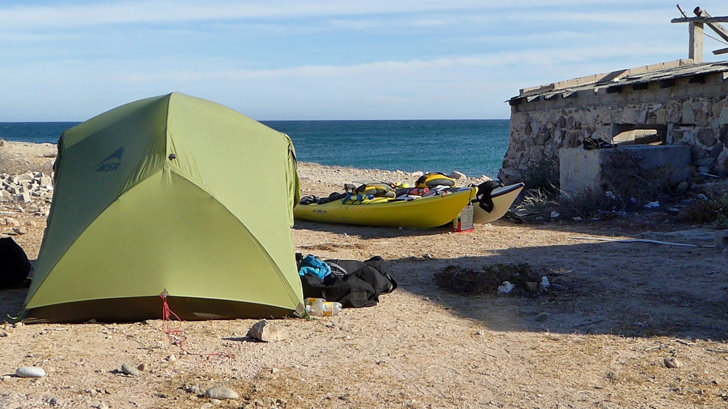 We were able to set up camp behind an abandoned building which not only gave us some wind protection, but also some shade.