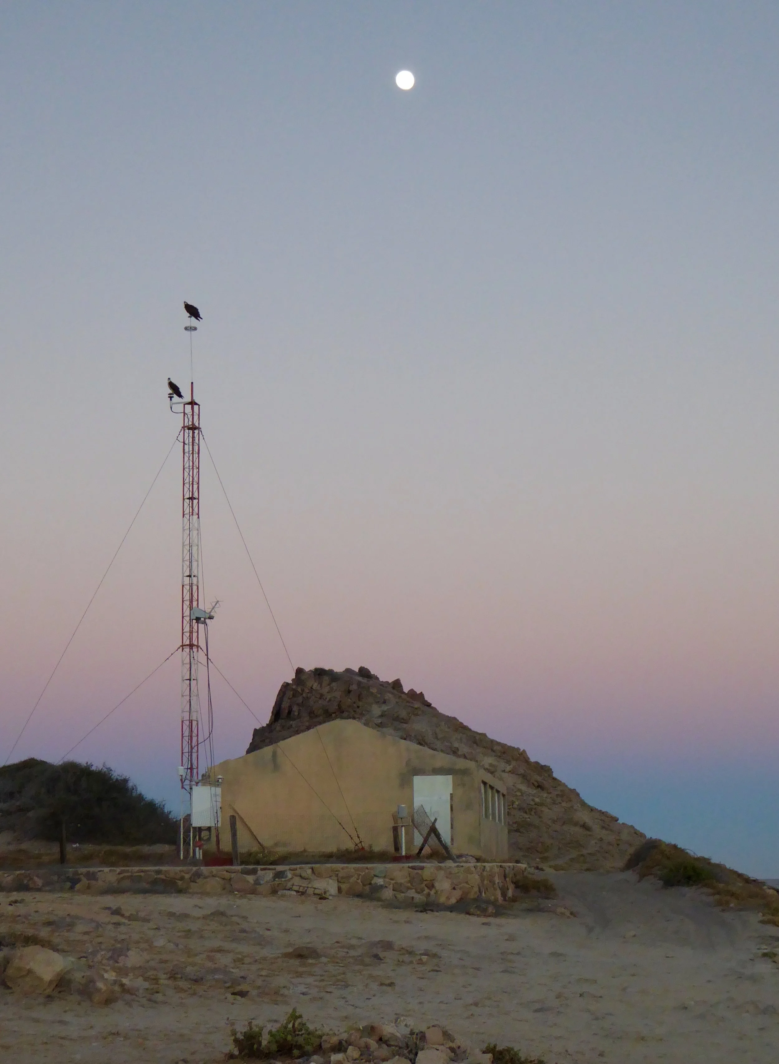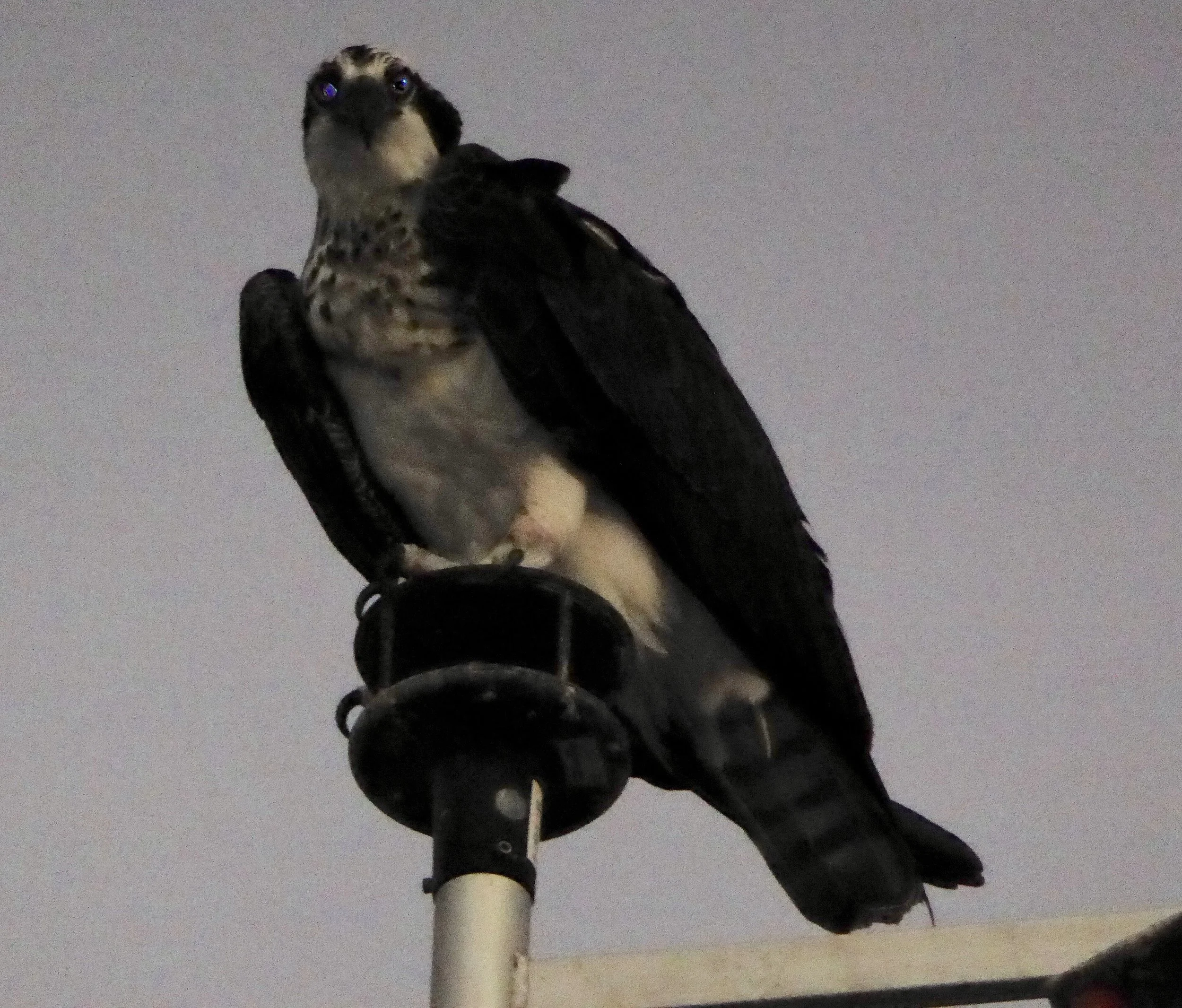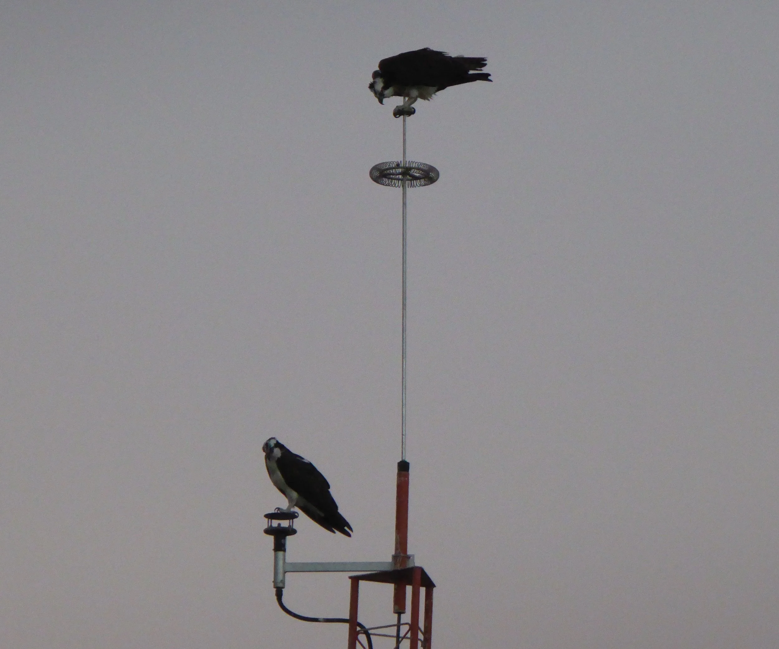 As the sun was setting two ospreys perched on a nearby tower.